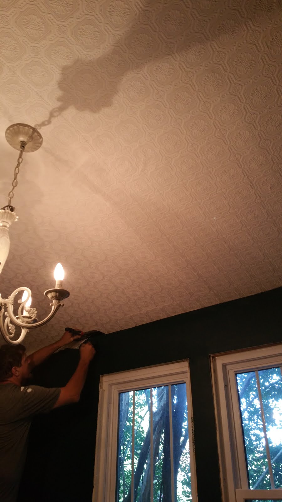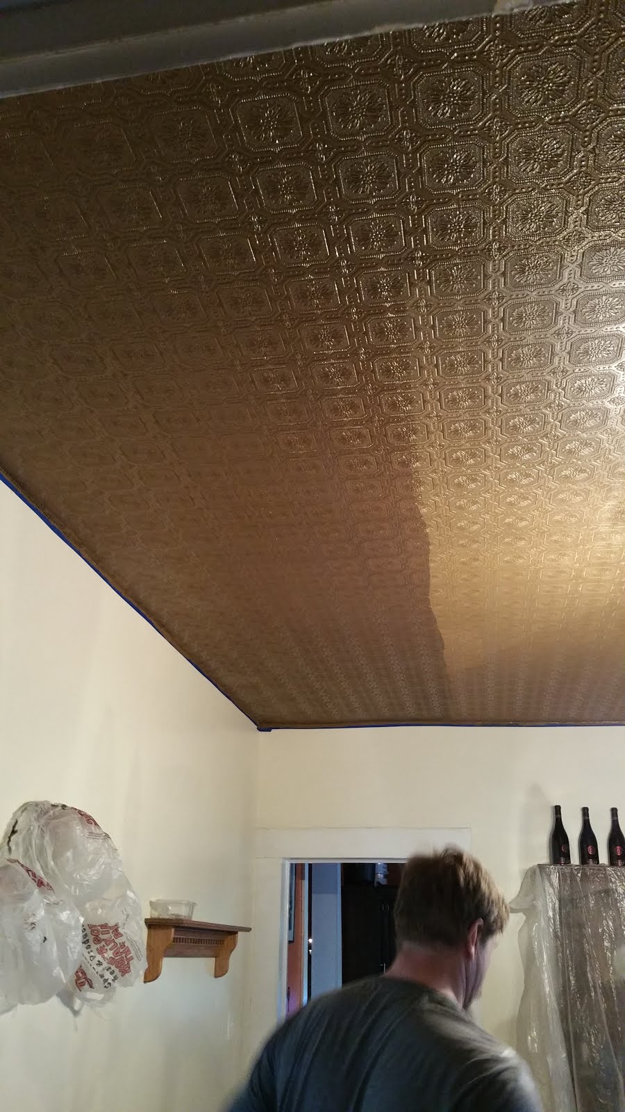 For the ceiling we really really wanted tin tiles, but cost was way way above our tight budget. The room is 15*20 and for actual tin it was going to cost about $8000, for the “fake” tin tiles you can get at Lowes it was going to cost $3000. Pinterest came to our rescue…someone had posted that they had used a wallpaper with a tile design on it and then painted it with metallic paint.