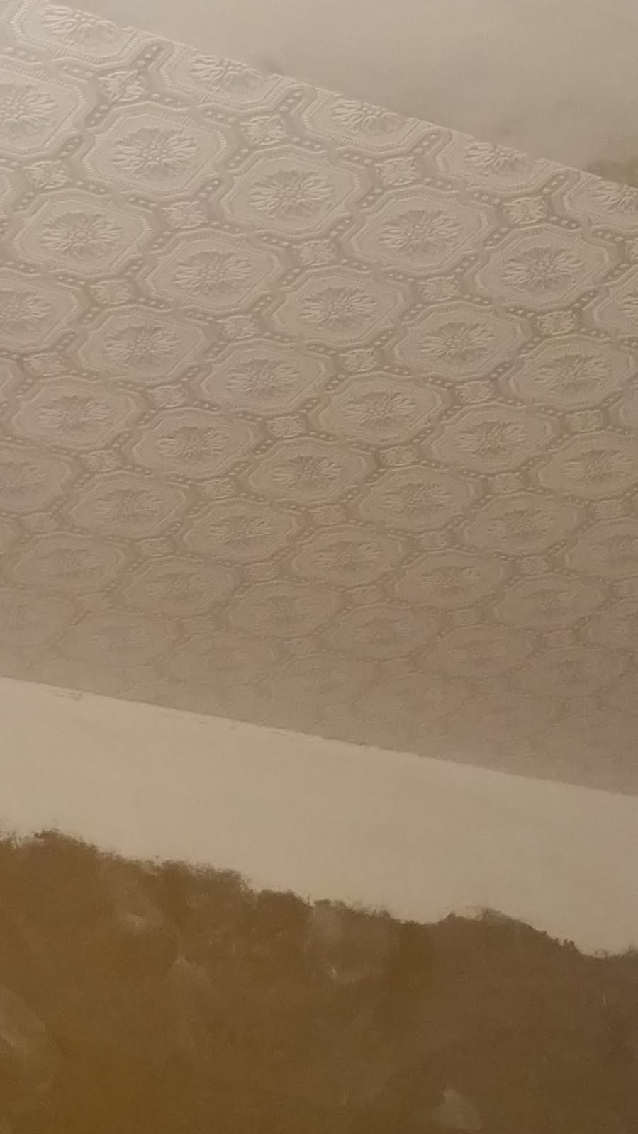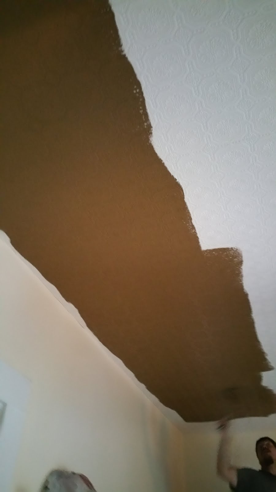 Once the wallpaper was up on the ceiling and had dried we set about painting it. First a light brown primer and then the metallic paint.