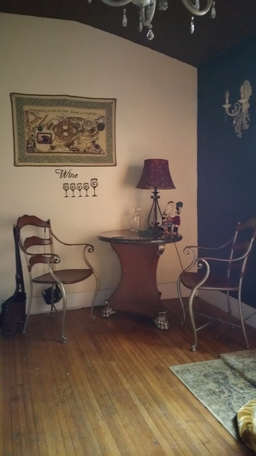 We decided to move the dining room to the back room, and converted this room into a study/pub. It’s a great place to sit while cooking dinner and to have some quiet time reading. Since these pictures we have picked up a shelf unit for our books that sites in the corner to the right of the window, and a different armchair.