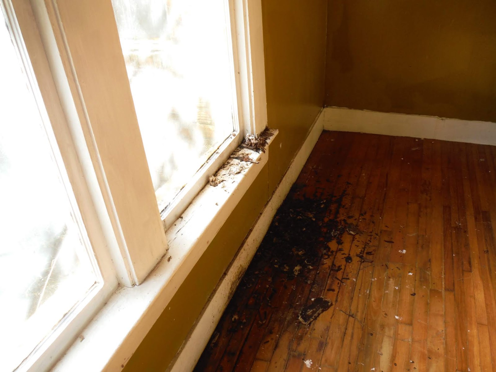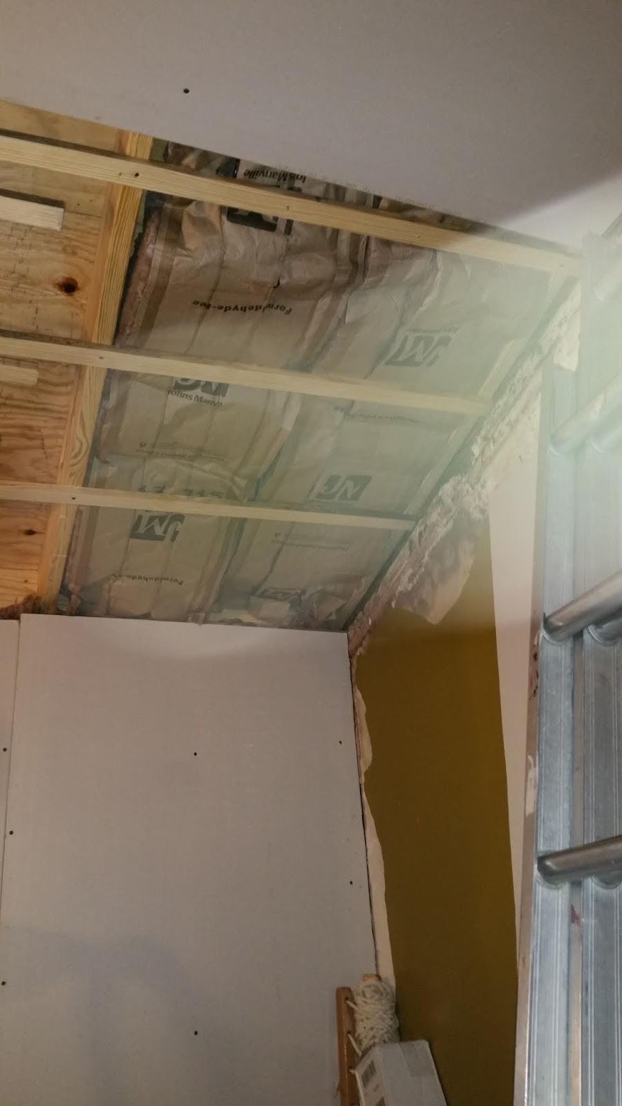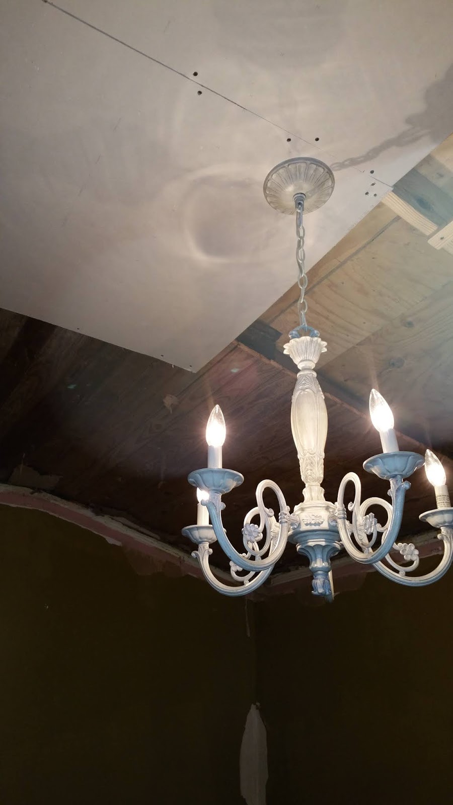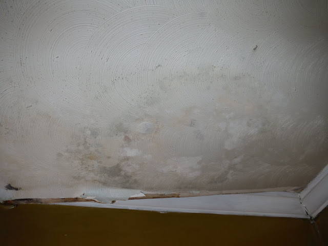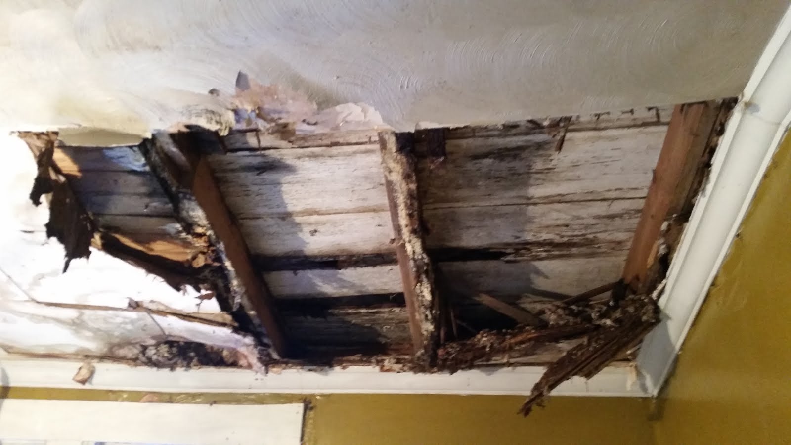 Jessica, her boyfriend Sam, and Kevin had to pull off the entire roof and replace it. After the roof was good, we had a new window installed and my husband started off with renovating the inside. About a quarter of the ceiling drywall was replaced as was a lot of the wall. I believe I posted before when Kevin replaced the floor beams on the floor. The pictures below are some of the original pictures we got from the inspection and this post concentrates on the inside.