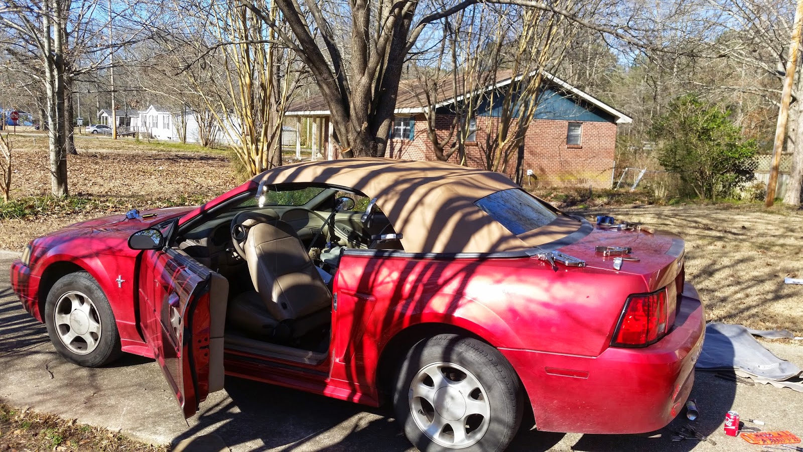 We desperately needed to replace the roof on the mustang. Hail damage and sun damage from Colorado had caused it to crack and leak badly. We kept on meaning to replace it but just never seemed to get around to it. So finally, Kevin decided to dedicate a weekend to the mustang and put on a new roof! I have such a great husband that is for sure!