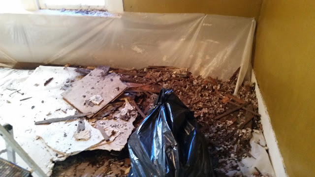 We were very lucky to have Sam and Jessica come to visit and they helped to pull down all the bad drywall on the ceiling and walls, remove the bad framing and roof. WOW what a mess, that is for sure. The smell was not particularly nice because of the mold.